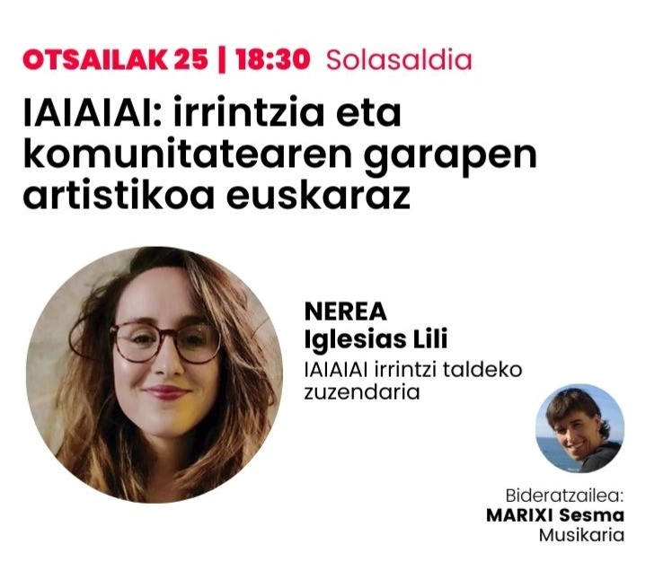 Datorren asteazkenean, otsailak 25, Nerea Iglesias irrintzilaria eta Marixi Sesma musikaria hizketan arituko dira, Alondegian, 18:30ean. Solasaldiaren izenburua IAIAIAI: irrintzia eta komunitatearen garapen artistikoa euskaraz izango da.