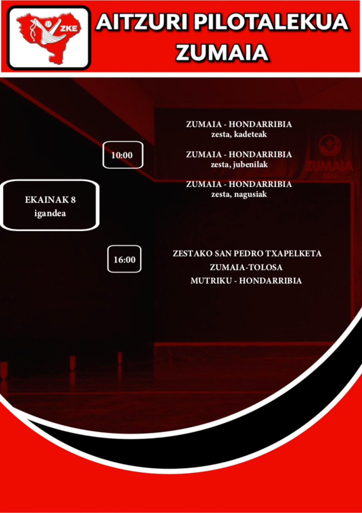 Pilota partidak jokatuko dituzte igandean Aitzuri frontoian, zesta punta modalitatean, hain zuzen. Goizeko 10:00etan hasita, Herriarteko txapelketako norgehiagoka jokatuko dute Zumaiak eta Hondarribiak. Arratsaldean, berriz, 16:00etan hasita, San Pedro txapelketako partidak izango dituzte: Zumaia eta Tolosaren artekoak lehenbizi, eta Mutriku eta Hondarribiaren artekoak jarraian.