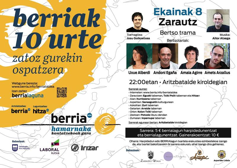 Berriak 10 urte beteko ditu ekainaren 21ean. 'Hamarnaka kontatzekoak gara' lelopean 32 kultur ekitaldi antolatu ditugu urteurrena ospatzeko eta Urola Kosta eskualdekoa larunbat honetan egingo da Zarautzen.