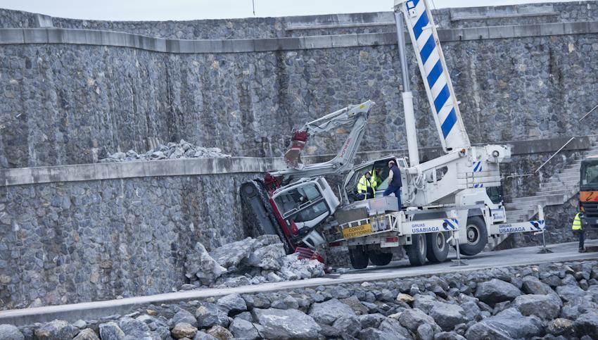 Astebururako berriro denboralea emanda dagoela eta, barraren aurrealdean itsasoak eragindako txikizioaren ondorioz pilatutako harriak kentzean aritu dira gaur arratsaldean. Garabiarekin batera, hondeamakina txiki bat eta kamioiak, harriak garraiatzeko. Lanak amaitzen ari zirela, 17:40ak aldera gertatu da istripua. Hondeamakina barraren goialdean zegoen, eta garabia beheko solairuan. Kable bidez hondeamakina lotu eta jaisten hasi direnean, askatu eta garabiaren gainera erori da. Barraren eta garabiaren artean kateaturik gelditu da, argazkiak ikus daitekeen bezala.