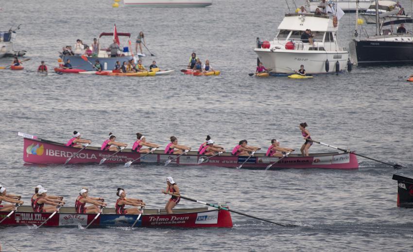Barrualderako luzean lehia ikaragarri polita izan dute Zumaiak eta San Juanek. Parez pare, batek besteari branka erakutsi nahi, inork ez du amore eman azken metroraino. Hibaikak ere hortzak estutu eta ahalegin guztiak egin ditu aurreko bien arrastoa ez galtzeko. Azken txanpan, Zumaiak sartu du muturra San Juanen aurretik. Estropada eta sailkapen nagusiko bigarren postua lortu dute zumaiarrek; 2014ko Kontxako Bandera, berriz, San Juanentzat. Inoizko banderarik borrokatuena izan da aurtengoa: bi jardunaldietako denborak aintzat hartuta, lehenak hiru segundo eta erdiko aldea atera die bigarrenari eta hirugarrenari.