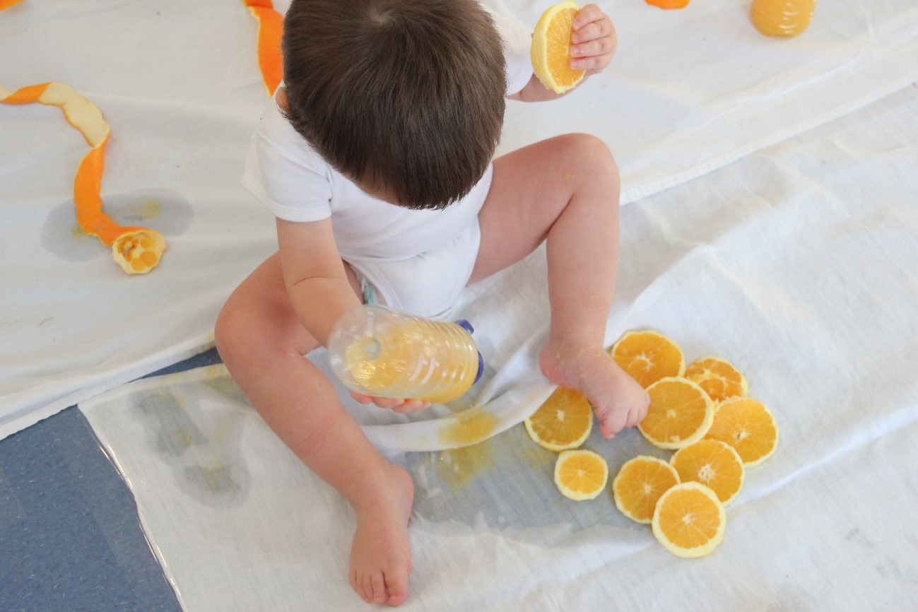 Eskolako txikienek ere esperimentazio tailerrean murgiltzeko aukera izan dute oraingoan. Irailean hasi genuen etxekotasun prozesuaren emaitzak ikusten hasiak gara dagoeneko, eta elkar ezagutu ondoren lasaitasuna nagusitu da gure eguneroko jardunean. Hori horrela izanik, prest gaude haurrengan berezkoa den sena, esplorazioa, asetzen eta lantzen hasteko: zitrikoekin jolasten ekin diogu bide zoragari horri. Izan ere, fruta horiek aukera paregabea eskaintzen digute beren usain, zapore, testura eta sentsazioekin, eta gure artista txikiek sekulako gozamena bizi izan dute. Nola gozatu gainera!