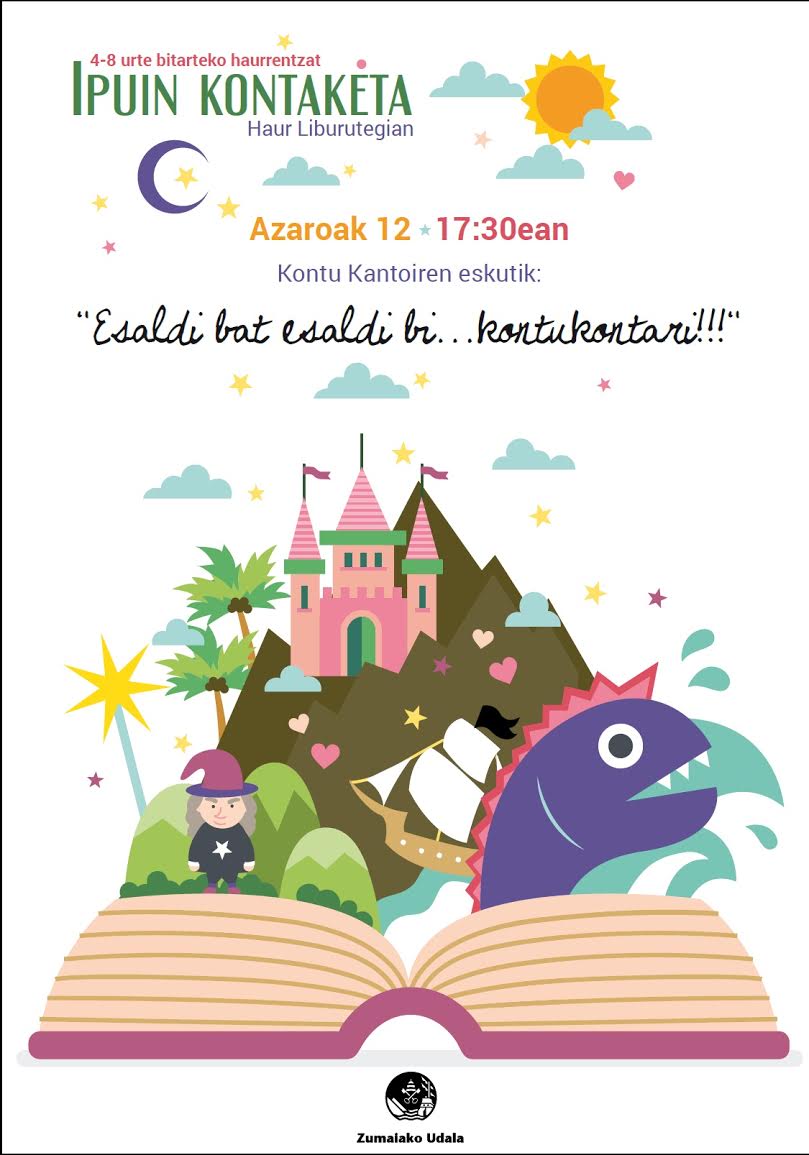 Bihar, azaroak 12, 17:30ean, haur liburutegian ipuin kontaketa saioa izango da 4-8 urte bitarteko haurrentzat. Kontu Kantoiren taldeko kideen eskutik, Esaldi bat esaldi bi……kontukontari saioa izango da.