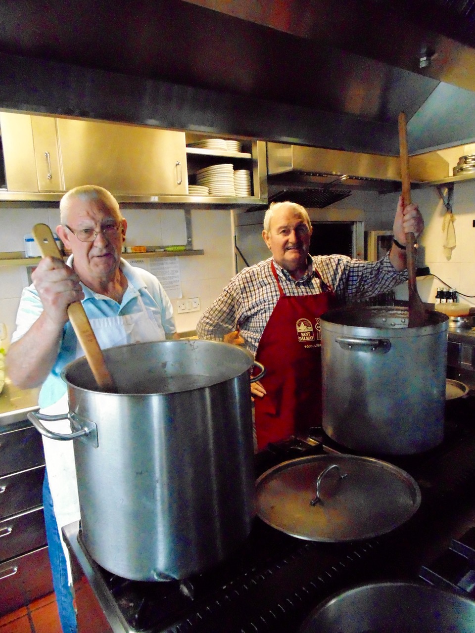 Pulpo elkartea sortu zela 64 urte bete dira gaur eta urteurren hori ospatzeko zer egokiago olagarro-zopa platerka bat hartzea baino. Eguerdiko 12:30ean hasi dira zopa banatzen, baina bazkide eta lagun batzuk ordu erdi lehenago elkartearen egoitzan ziren Bixente, Felix eta Marianoren laguntzarekin, marmita handietan prestatzen ari zen jakiari begira.