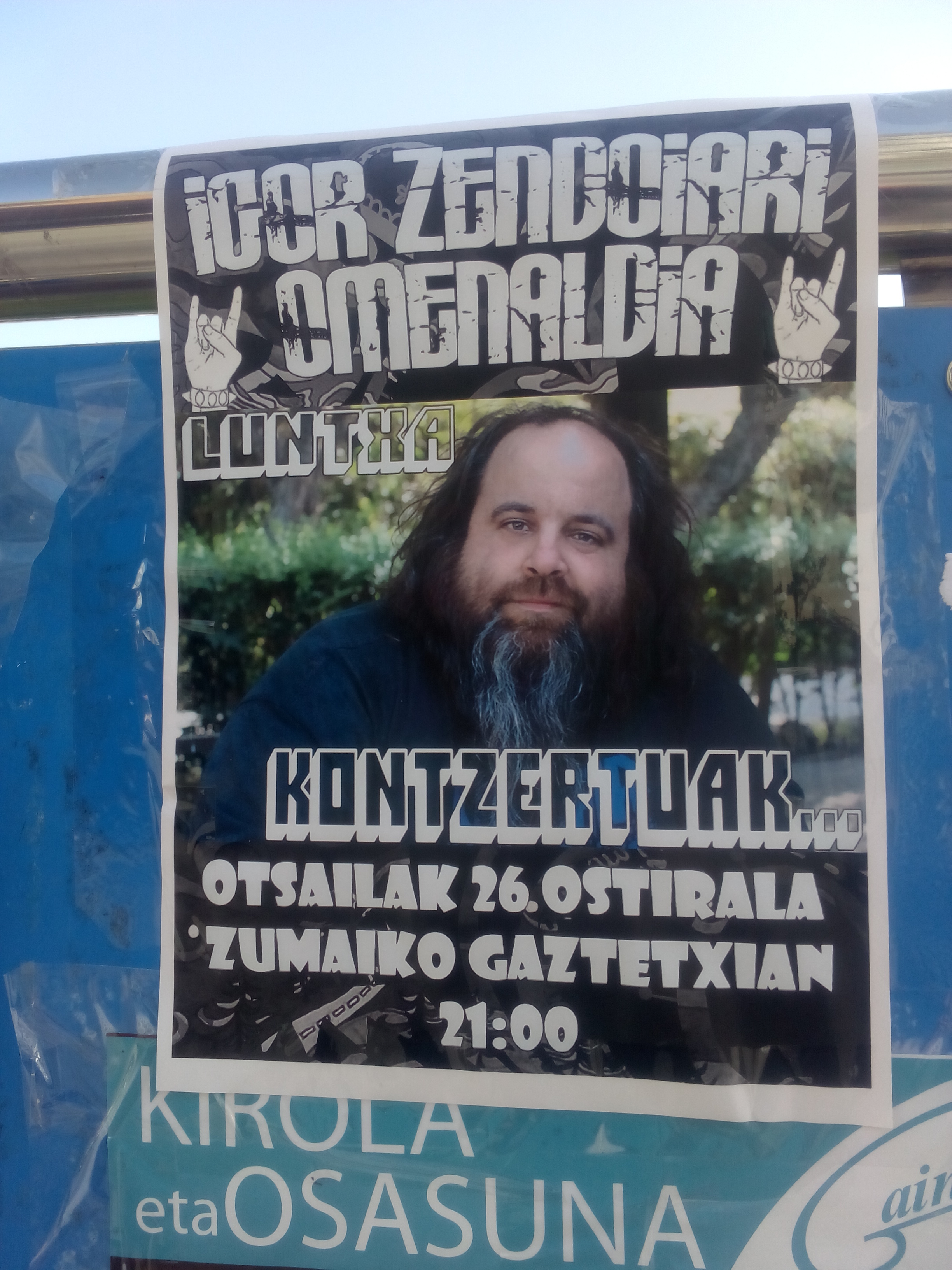 Otsailaren hasieran hil zen Igor Zendoia, Aek-ko irakaslea, euskalzalea eta musikazale porrokatua. Herriko zenbait taldek bere omenezko kontzertua eskainiko dute ostiral honetan, 21:00etatik aurrera, Torreberri Gaztetxean. Luntxa ere izango da. Maite zuen musikarekin gogoratuko dute Igor herriko taldeek.
