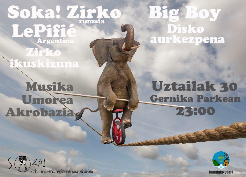 Zumaiako Soka! zirko eta Argentinako LePifiék taldeetako kideek zirko giroa ekarriko dute. Jarraian, Zumaiako Big Boy taldeak Zapasalto disko berria aurkeztuko du zuzenean.