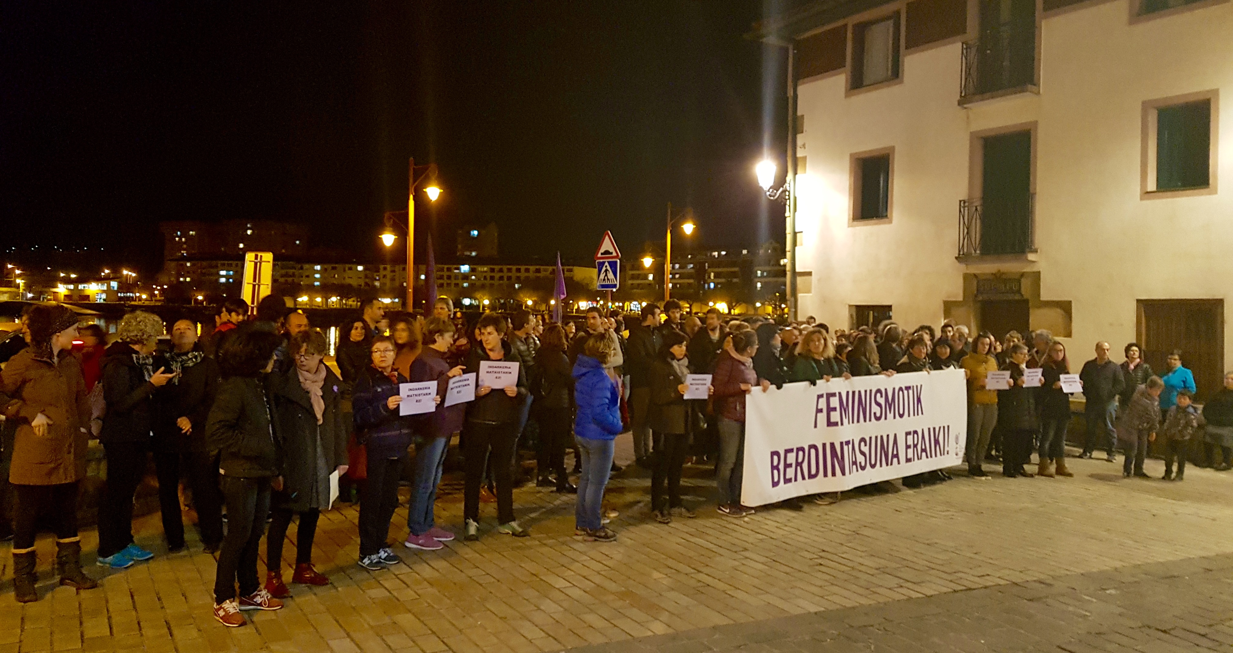 Berdintasuna feminismotik eraiki lema zeraman pankarta baten atzean jarri dira bertaratu direnak. Isilune baten ondoren, Berdintasun Foroko kide batek ohar bat irakurri du. Erailketa bat bera ere gehiago ez izatea eskatu du: "Egunero egunero erailtzen dituzte emakumeak, edota haurtxoei labankadak ematen dizkiete, euren amei min emateko. 2017 honetan, 20 emakume erailiak izan dira Estatu Espainiarrean, milaka emakume eraili urtero-urtero mundu mailan". Txalo artean amaitu da ekitaldia.