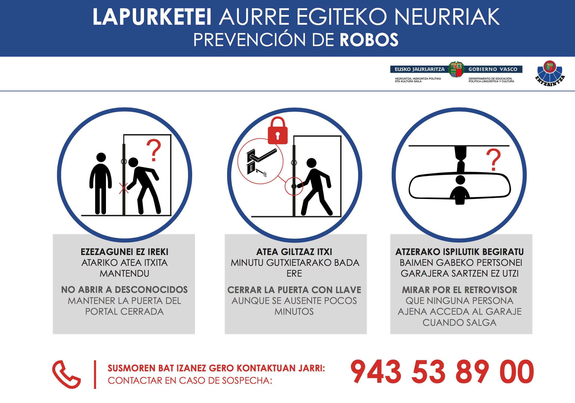 Lapurreta gehienak martxoan eta apirilean gertatu ziren eta, Ertzaintzak dioenez, dagoeneko asko murriztu dira. Hala ere, lapurrek erabilitako sistemak aztertu ondoren, eskualdean informazio kanpaina bat egitea erabaki du Ertzaintzak. Oinarrizko babes neurriak azaltzen dituen kartel bana jarriko dute etxe atari bakoitzean. Albiste honetan bertan daukazue Ertzaintzak banatuko duen informazioa.