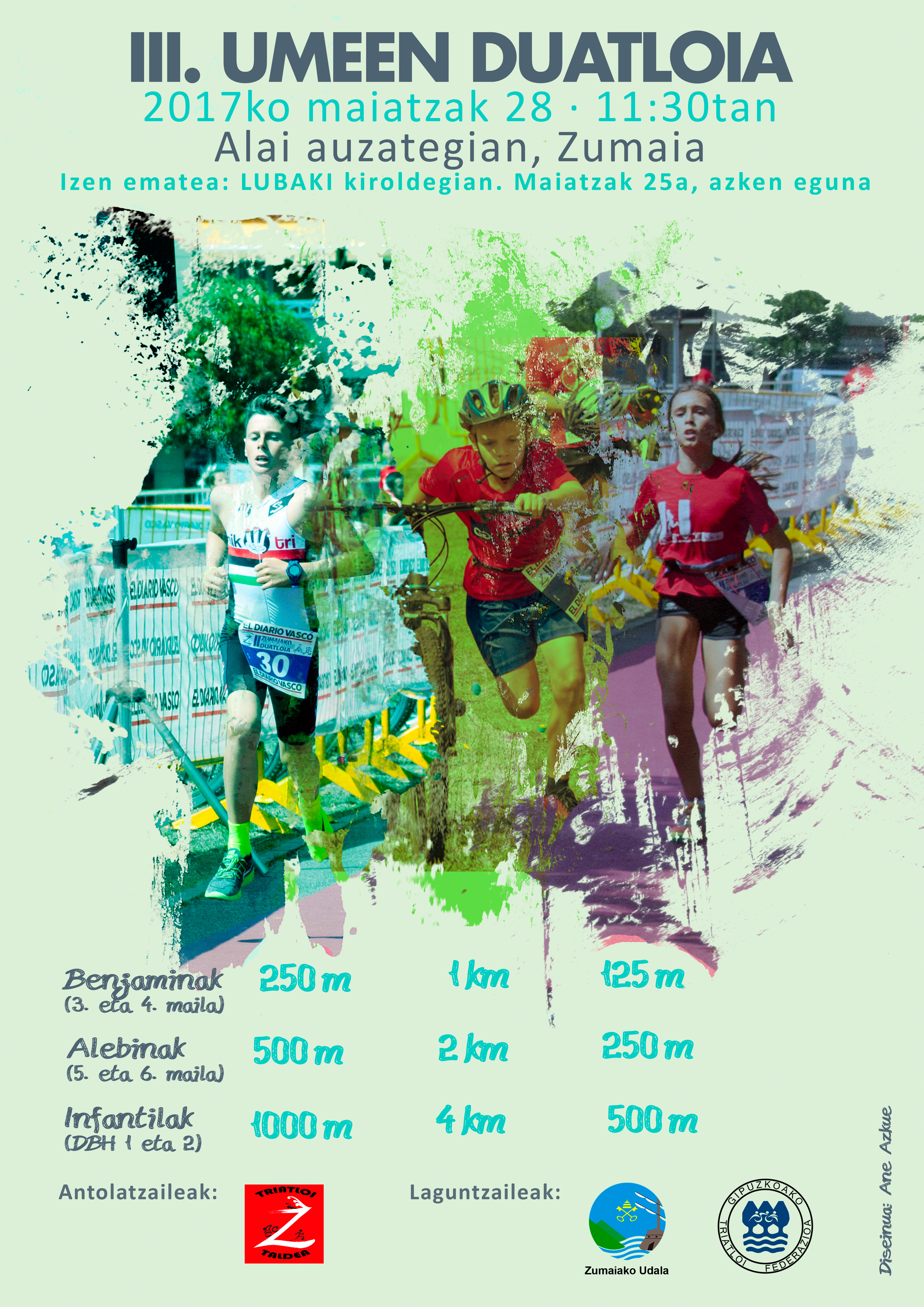 Benjaminek 250 metro korrika, 1.000 metro bizikletan eta 125 metro korrika egin beharko dute. Alebinek berriz, 500 metro korrika, 2.000 metro bizikletan eta 250 metro korrika osatuko dute. Bukatzeko, infantil mailako gazteek 1.000 metro korrika, 4.000 metro bizikletan eta 500 metro korrika egingo dute.