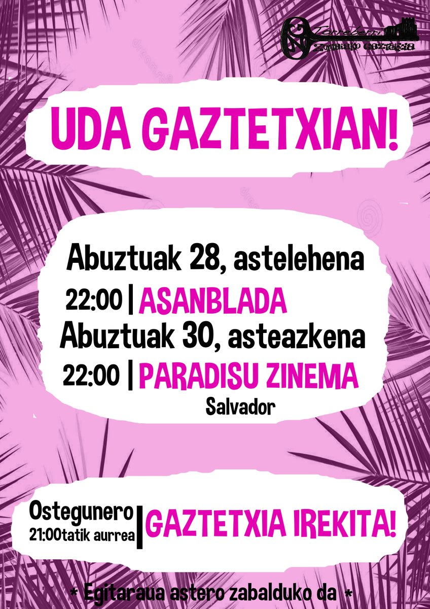 Bestalde, gogoratzen dute ostegun honetan ere Gaztetxea zabalik izango dela, 21:00etik aurrera.