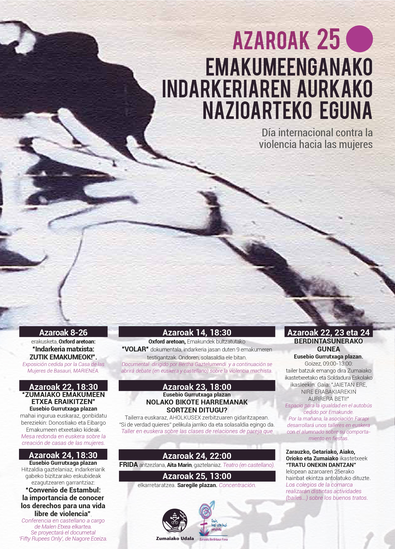 Azaroaren 22an, 23an eta 24an, arratsaldero, hitzaldiak eta mahai inguruak izango dira Beheko plazan kokatuta egongo den Berdintasun Gunean. Bihar esaterako, Zumaiako emakumeen etxea eraikitzen mahai ingurua izango da euskaraz,18:30ean. Gonbidatu bereziak egongo dira: Donostiako eta Eibarko Emakumeen etxeetako kideak.