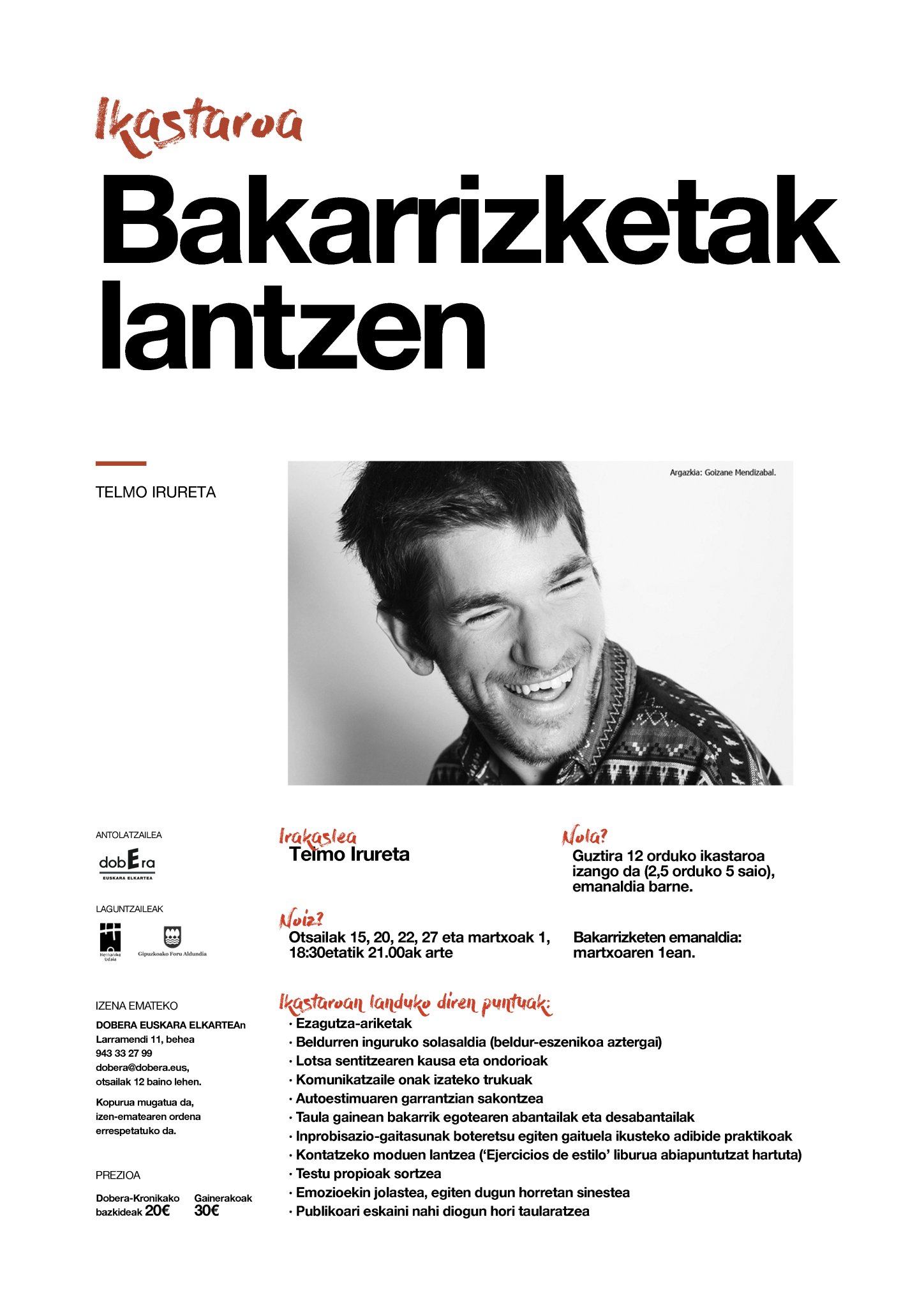 Telmo Irureta zumaiarrak Bakarrizketak lantzen izeneko ikastaroa emango du Hernanin. Otsailaren 15etik martxoaren 1era bitartean emango da 12 orduko ikastaro hau. Amaieran, emanaldi bat izango da.