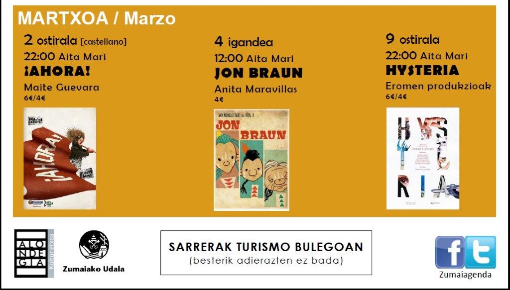Martxoaren 4an, igandean, eguerdiko 12:00etan, haurrentzako Jon Braun saioa izango da, Alicia Maravillas konpainiaren eskutik. Sarrerak 4 euroan daude salgai.