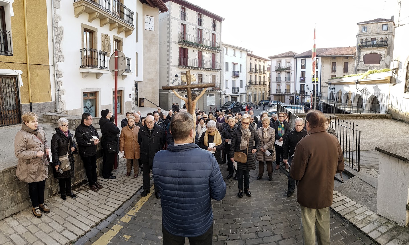 Aste Santuko ospakizunen baitan, gaur goizean gurutze bidea egin dute. Jesukristok kalbariora egin zuen bidea gogoratu dute goiko plazara gerturatu diren fededunek. Gurutzea aurretik, errezuak eginez egin dute Arritokietarainoko bidea.