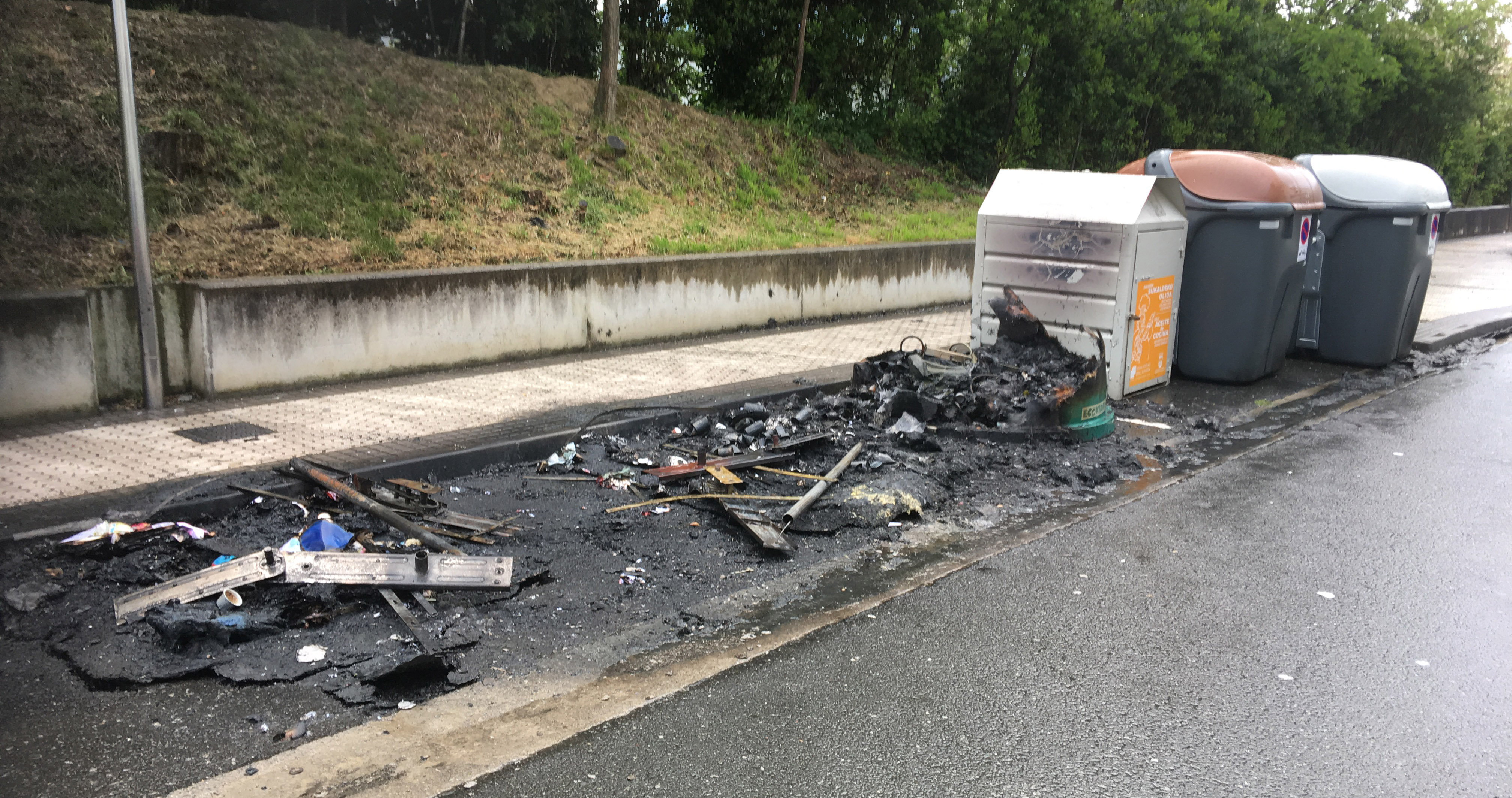 Larrialdi zerbitzuak joan diren arren, beira, papera eta ontzi arinak bereizteko edukiontziak erabat kiskalita gelditu dira, argazkian ikus dezakezuenez.