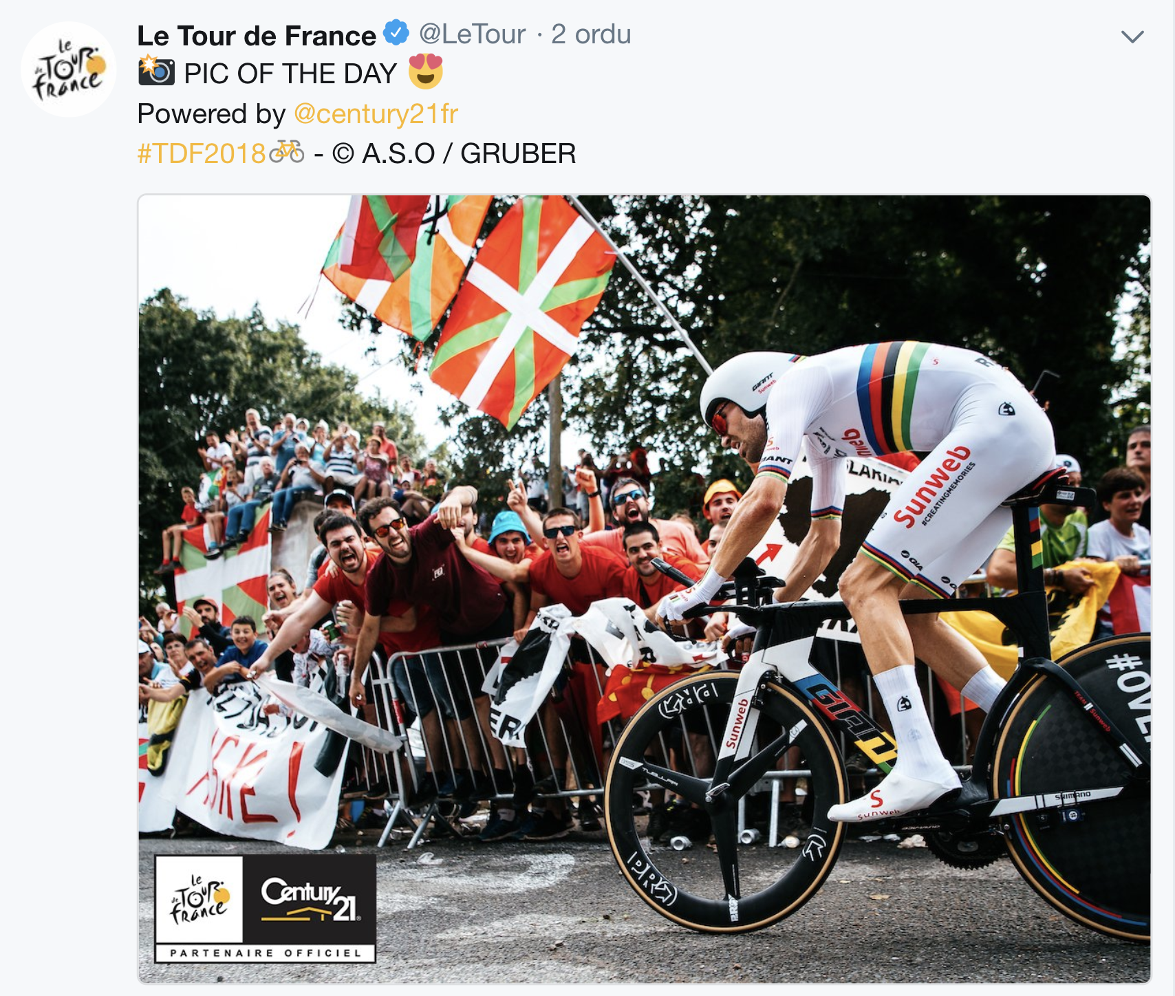 Gaur milaka euskal txirrindularitzazale bildu dira Senperen, Tourreko erlojupeko erabakigarriak erakarrita. Tom Dumoulinek irabazi du etapa eta, hara, Tourrak aukeratutako eguneko argazkian, hor ageri da munduko txapelduna gorriz jantzitako koadrila baten hauspoa jasotzen. Zumaiarrak eta Dumoulin, eguneko argazkian!
