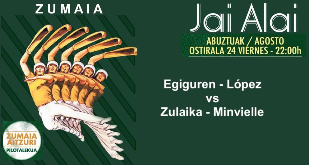 Jai Alai World Tourren barruan, Zumaian jokatuko den txapelketako lehen finalaurrekoa jokatuko da abuztuaren 24an, 22:00etatik aurrera, Aitzurin. Egiguren eta Imanol Lopez zumaiarra, Zulaika eta Minvielle-en aurka arituko dira. Aurretik, gazteen partida jokatuko da. Sarrerak 10 euroan izango dira salgai.