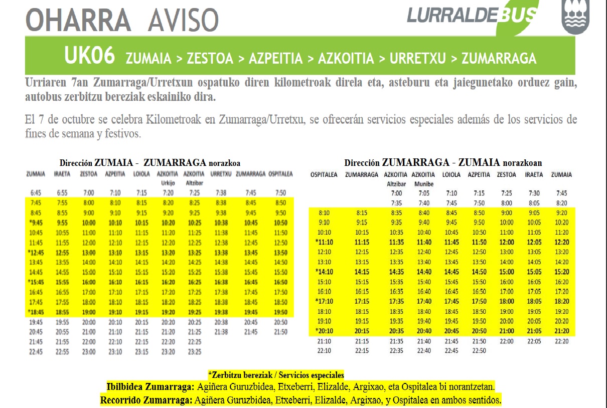 Ohikoa baino ordutegi zabalagoa izango du igandean Lurraldebusen UK06 lineak. Zumarraga eta Urretxu artean ospatuko den Kilometroaren festa da horren zergatia.