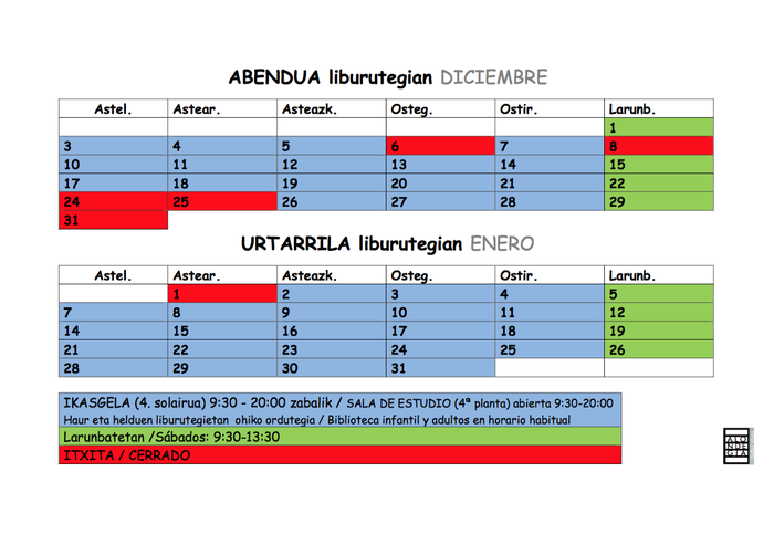 Abenduan eta urtarrilean astelehenetik ostiralera 09:30etik 20:00etara bitartean egongo da zabalik Alondegiko 4. solairuko ikasgela. Larunbatetan goizez zabalduko dute, 09:30etik 13:30era.