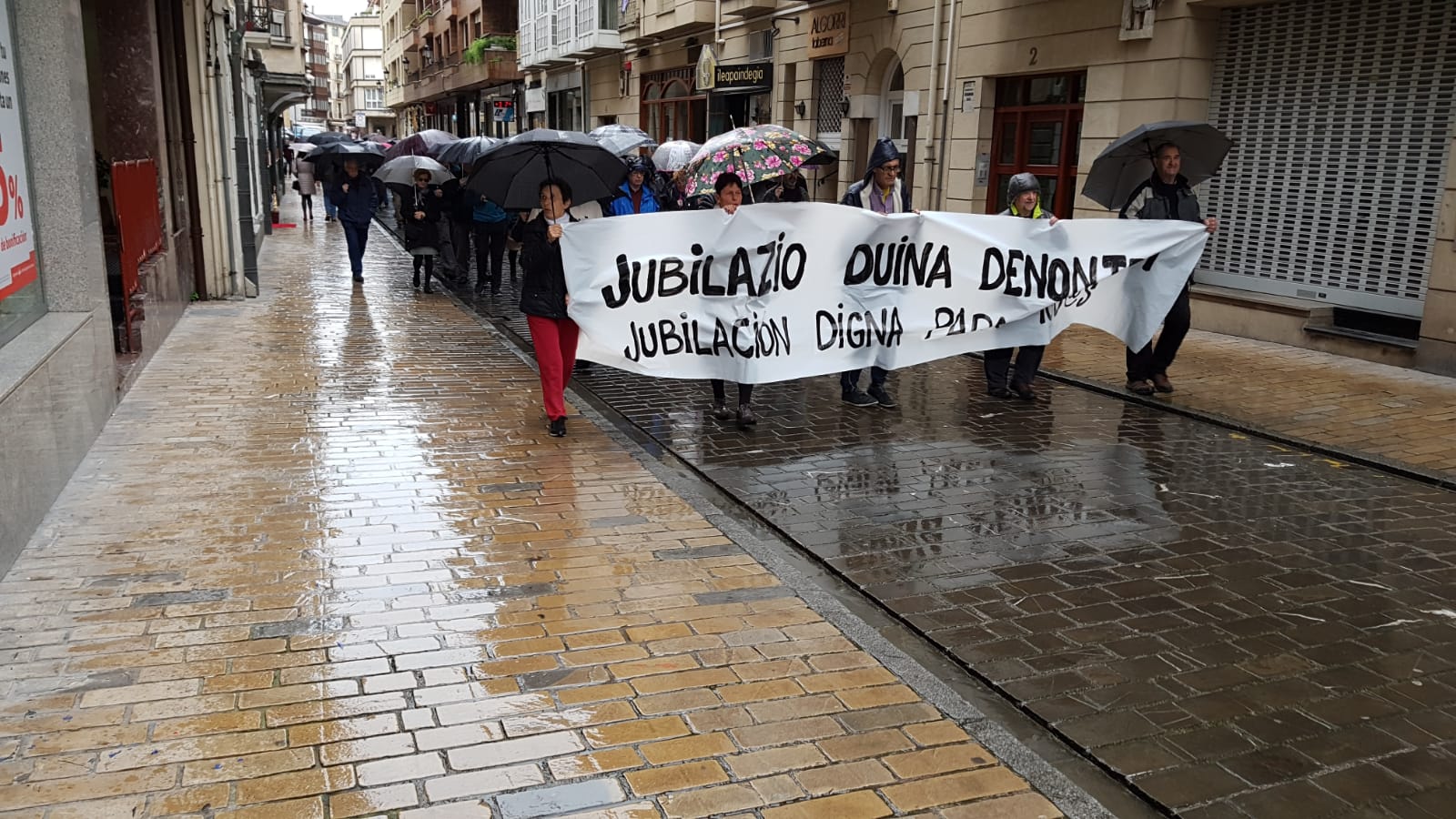 Udaraz geroztik Saregileen plazan elkartzen dira herriko hainbat jubilatu eta pentsionista astelehenero. Jubilazio duinen aldeko pankarta eskuan, beraien borrokak ez du etenik. Gaur, elkarretaratzea egin beharrean, manifestazioa egin dute Erribera kalean zehar.