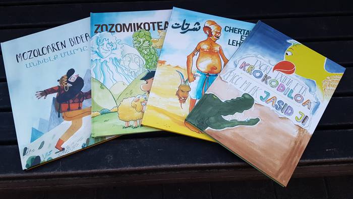 Euskara elkarte honek ateratako lau ipuin ilustratu salduko dituzte igandean: Zozomikoteak (euskaraz), Mozoloaren bidea (euskaraz eta armenieraz), Chertal eta lehoia (euskaraz eta arabieraz) eta Txori txikia eta krokodiloa (euskaraz eta Senegaleko wolof hizkuntzan). Liburuak ilustratzeko jatorrizko artistak hautatu dituzte. Hala, azken bi ipuin hauek Saharako eta Senegaleko artistek ilustratu dituztela adierazi du Jexux Eizagirrek. Hernanin bizi den zumaiar honek lotura estua du arraun elkartearekin, eta bere bidez salduko dituzte ipuinak igandean.