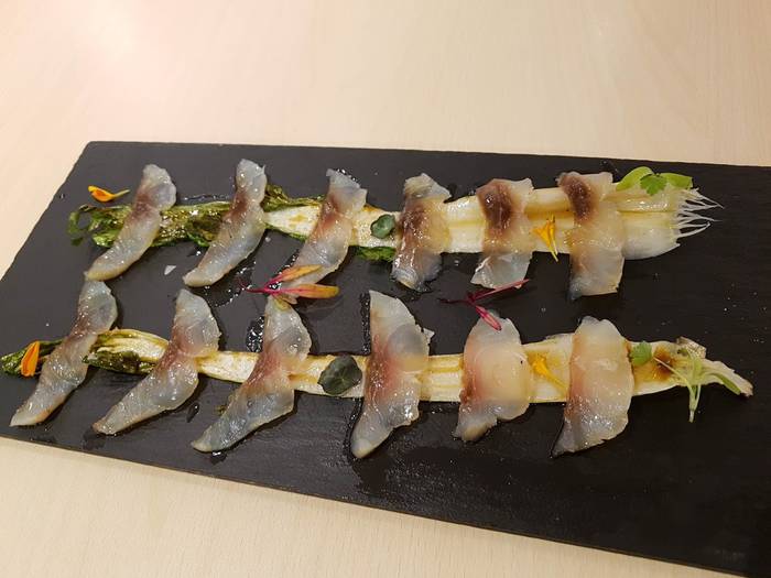 Malagako Restagrup etxearekin akordioa sinatu genuen iazko azaroan. Honek taldeekin lana egiteko aukera emango digu urte osoan zehar. Hilabetera, abenduan, deitu zidaten galdezka ea prest egongo nintzatekeen Fiturrera joateko, beraien standean nire plater batzuk prestatzera. Arazo bat dago Fiturren, eta da bertan ezin dela kozinatu; ezin da plater berorik zerbitzatu. Olagarroa prestatu nahi nuen, hemen egiten dugun olagarro txistorra. Hori eraman nahi nuen, baina berotzeko zeuden arazoak ikusita, pentsatu genuen lasuna eramatea. Deskarteko arrainekin ari gara lanean, lehen mailakoak ez diren arrainekin: sardina, berdela, makaela, aingira, eta, batik bat, lasunarekin.