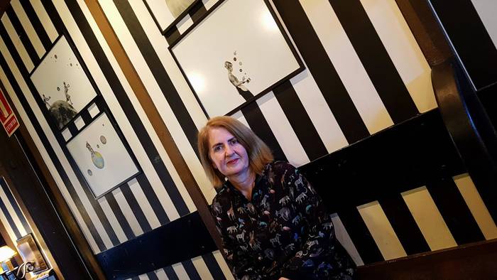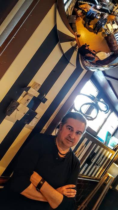 Azken honek egurrarekin eta burdinarekin egindako instalazioak kokatu ditu, taberna beraren zuri-beltzezko hormaren diseinua jarraituta. “Banuen proposamen hori buruan aurretik, eta taberna honetarako egokia iruditu zitzaidan. Lanak espazio jakin batera egokitzea ariketa polita da”, dio.