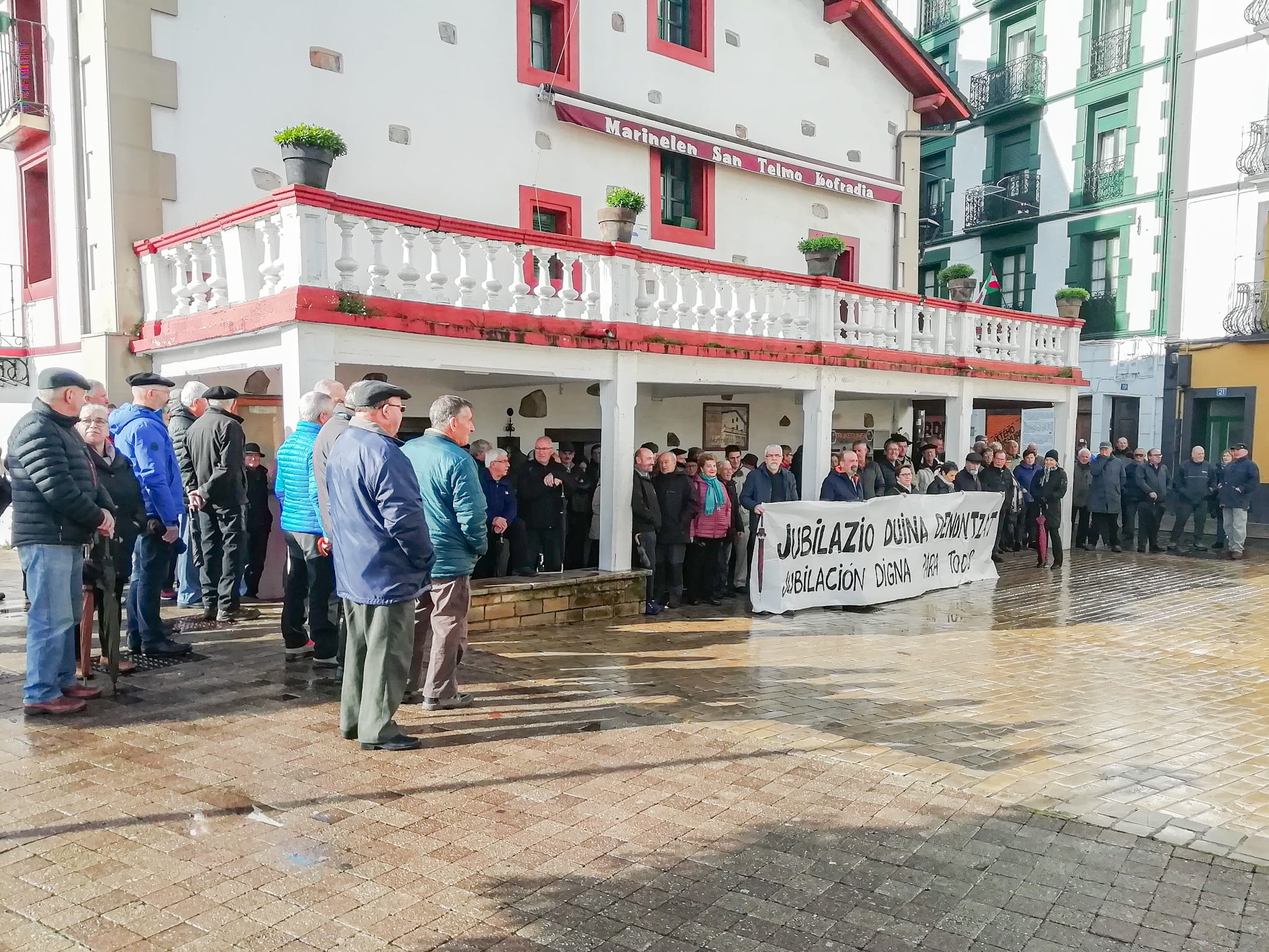 Zumaiako pentsiodun talde bat Kofradian elkartu da, astelehenero bezala, pentsio duinak exijitzeko. Ia bi urte daramatzate borrokan, eta oraingo eta etorkizuneko pentsio duinen sistema publikoa legez bermatu arte, mobilizazio gehiagorekin erantzuteko asmoa azaldu dute.