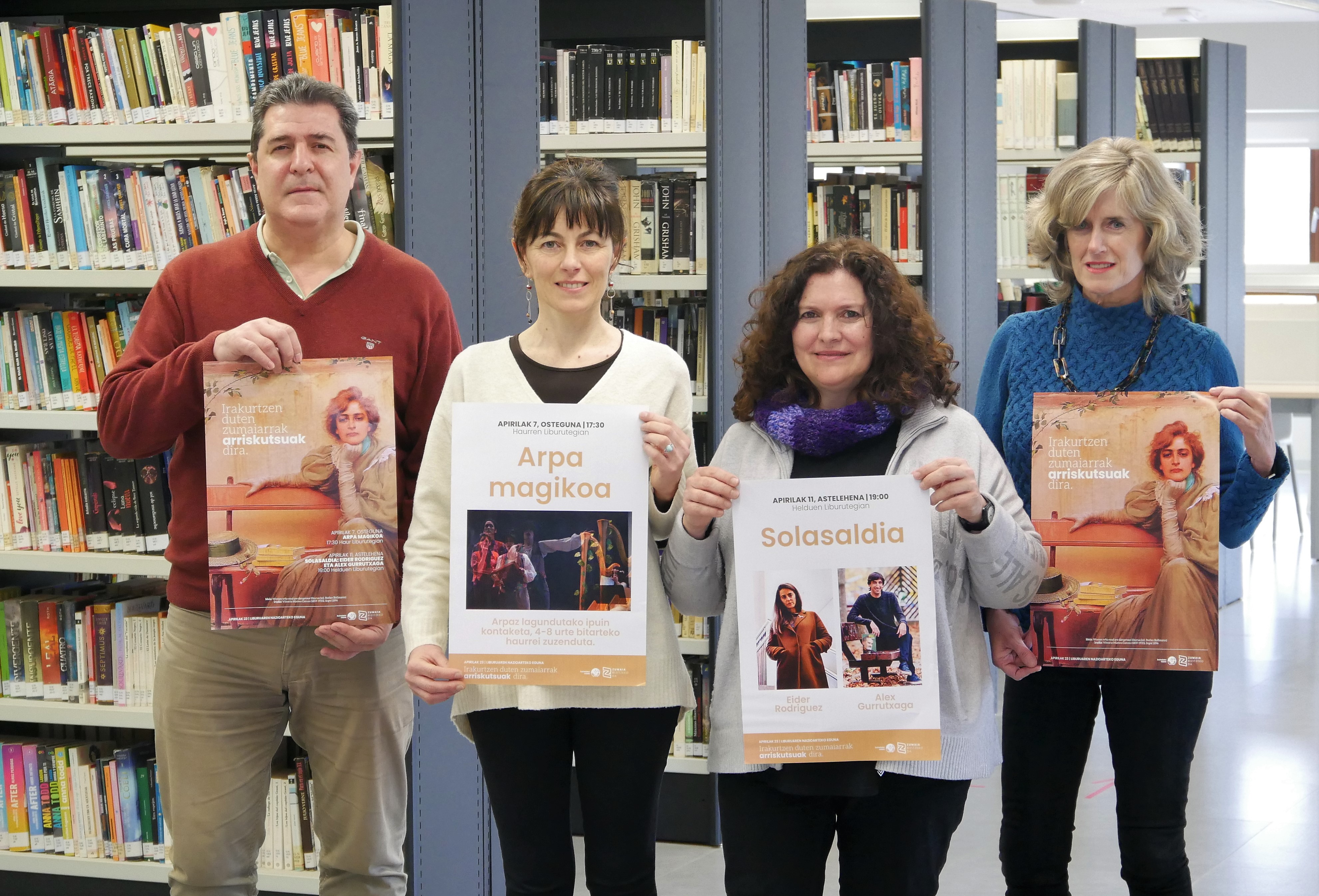 Apirilaren 7an harpaz lagundutako ipuin kontaketa izango da haurren liburutegian, 17:30ean hasita. Mapa eskutan hartuta, Arpa Magikoaren lurralde ezkutura eramango dituzte haurrak, liburu magikoaren barruak ezagutzera. Ekitaldia lau eta zortzi urte bitarteko haurrei zuzenduta egongo da. Apirilaren 11n, berriz, Eider Rodriguez idazlea elkarrizketatuko du Alex Gurrutxagak. Idazleak argitaratu berri duen Eraikuntzarako materiala liburuaz arituko dira, baita literaturaz eta irakurketaz ere. Liburutegiko azkenengo solairuan izango da elkarrizketa, 19:00etan hasita.
