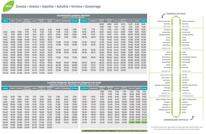 Aldaketak izango dira Zumaia eta Zumarraga arteko UK06 linean. Autobusak orduero aterako dira Zumaiatik: goizeko 6:45ean abiatuko da lehenengoa eta 22:45ean azkena. Zumarragatik Zumaiara arteko zerbitzua, berriz, 7:10ean hasten da eta 22:50ean bukatu.