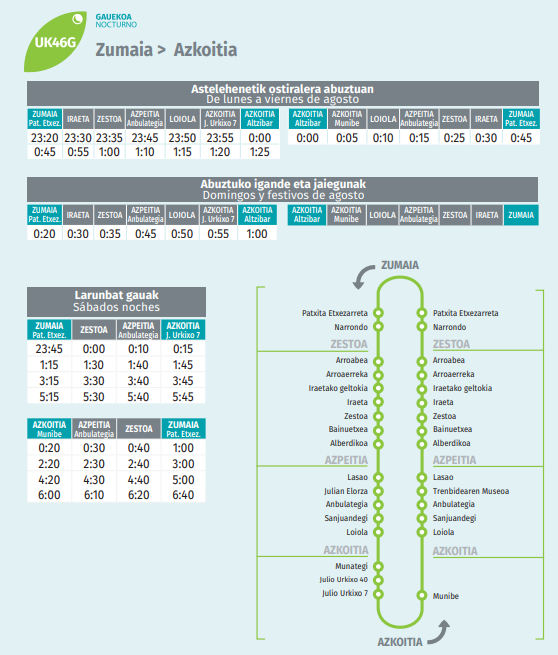 Abuztuan sartzearekin batera aldaketak egin dituzte eskualdeko autobusen ordutegietan, eta hainbat zerbitzu kendu eta beste batzuk gehitu egin dituzte. La Guipuzcoana enpresak bere webgunean jakinarazi duenez, lau autobus zerbitzutan izango dira aldaketak: Azkoitia-Donostia (UK01), Azkoitia-Zarautz (UK03), Zestoa-Ermua (UK05) eta Zumaia-Zumarraga (UK06) zerbitzuetan, hain zuzen ere.