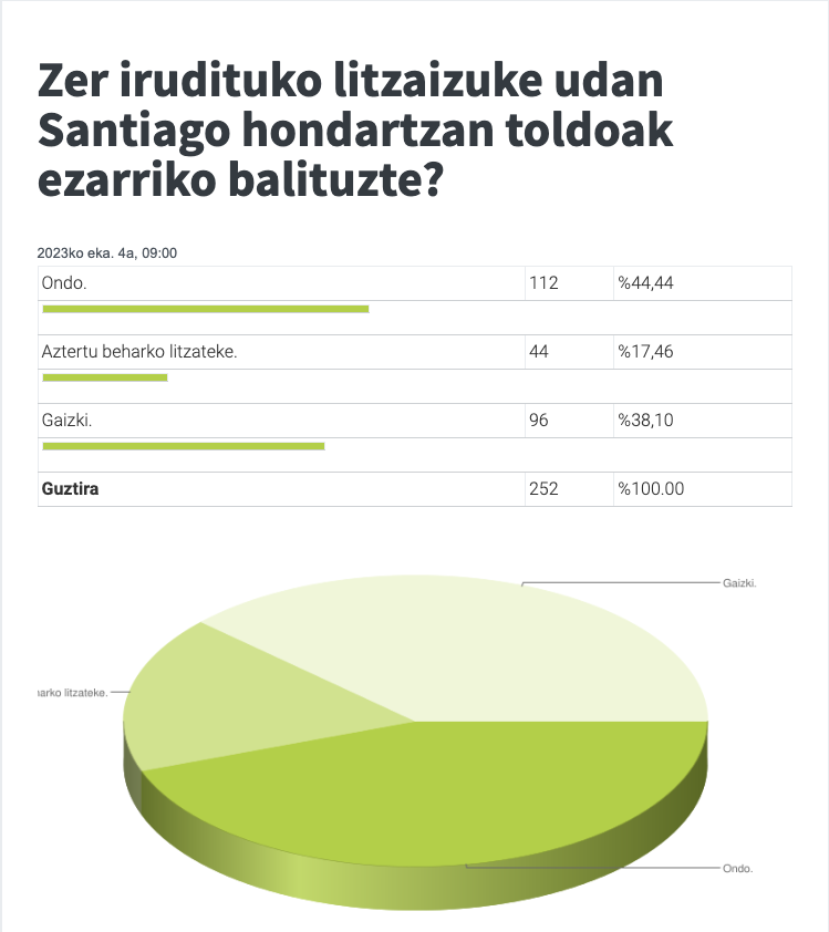 Baleike.eus-ek galdera berria jarri du inkestan: Zer urte sasoi gustatzen zaizu gehien? Eman botoa honako lotura honetan. Aurreko inkestan, Santiago hondartzako toldoen ingurukoan, 252 lagunek eman dute boza.