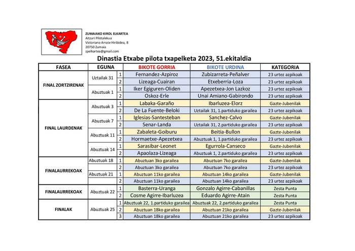 Datorren astean 23 urtez azpikoen kategoriako bi final zortziren izango dira, eta gazte eta jubenilek ekingo diete lehiari gero, abuztuaren 3tik aurrera, final laurdenetan. Puntistek, berriz, finalaurrekoetan jokatuko dituzte lehen partidak. Hiru kategoriatako finalak abuztuaren 25ean izango dira Aitzurin. Partida guztiak 21:00etan izango dira.