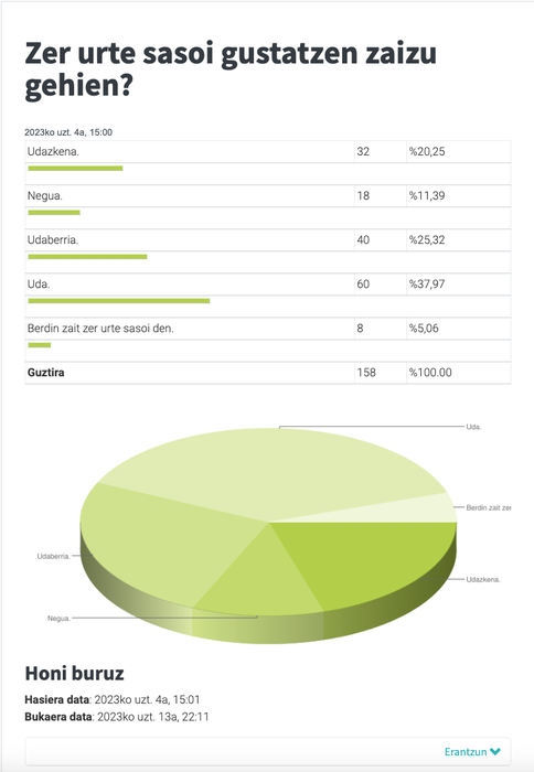 Aurreko inkestan, honako galdera hau egin zuen Baleike.eus-ek: Zer urte sasoi gustatzen zaizu gehien? 158 lagunek erantzun dute inkesta horretako galdera, eta honako hauek dira jasotako emaitzak: