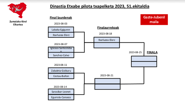 Beraz, ostiralean Zabaletak eta Goiburuk Cestauren eta Bullonen kontra neurtuko dituzte indarrak. Final laurdenetako partida izango da, eta bi bikoteetako batek finalerdietarako txartela eskuratuko du.
