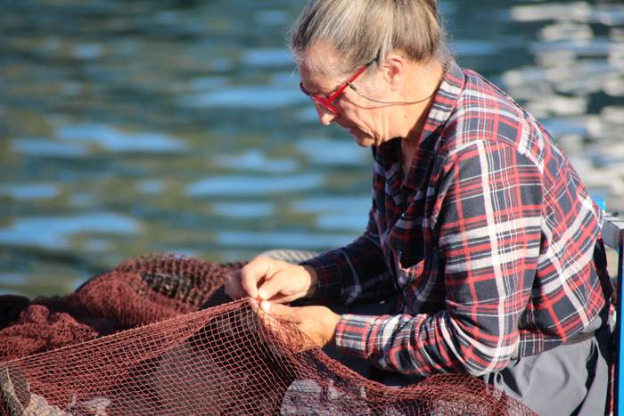 2002. edo 2003. urtea izango zen. Nire senarra arrantzalea zen, itsasontziko patroia. Hala, sareak konpontzeari ekin nion. Hiru bat urtez aritu nintzen horretan, eta sareak josten ikasteko denbora bakarrik eman zidan. Gero, ordea, banandu egin ginen, eta lana uztea erabaki nuen. Duela hiru urte berriro hasi nintzen, eta horretan nabil.